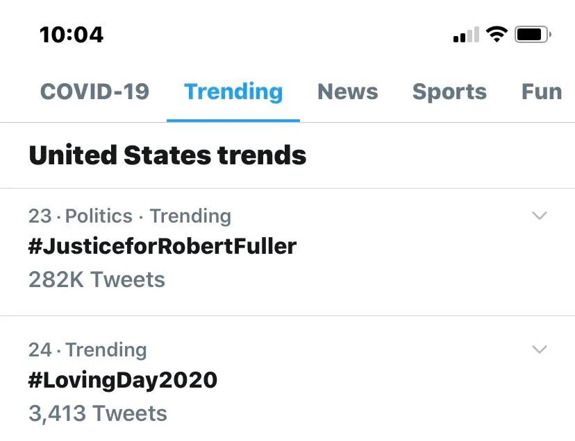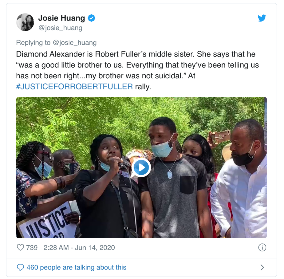 推特上,#为罗伯特·富勒伸张正义(#JusticeforRobertFuller)的话题,一度被顶上美国热搜榜单第二位,人们拒绝草率结案。
