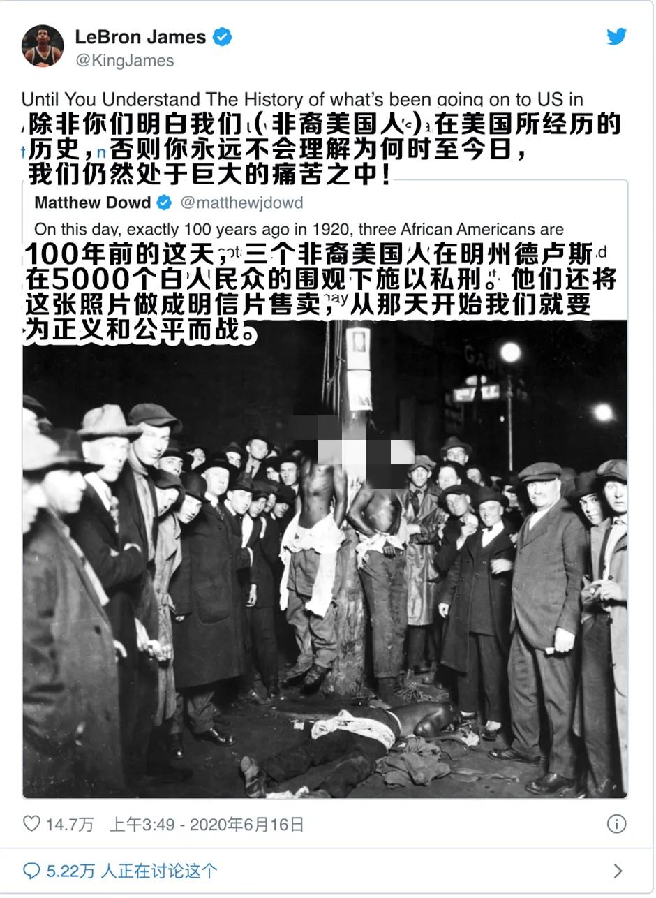詹姆斯转发的推文配图,正是一张上世纪20年代美国黑人被绞死的历史照片。