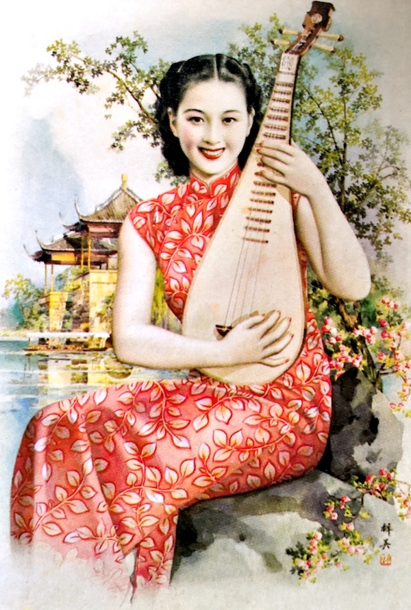 《琵琶少女》画面非常简单:一位少女在湖边弹奏琵琶,一身通体红色的旗袍,洋溢着喜气,身后的绿叶红花和远处具有民族风格的楼台亭阁,点明了季节和场地;最让人感到莫名惬意的是少女的表情,温婉柔美地甜甜一笑,就把少女的最美展露无遗,微微露齿的双唇弧线,若隐若现的浅浅酒涡,仅仅显出三分之一的耳郭隐藏在乌黑美发之中,一切恰到好处,一切尽在不言处。此景此情,似乎只有《诗·卫风·硕人》中赞美女子的千古名句才能形容:“手如柔荑,肤如凝脂,领如蝤蛴,齿如瓠犀。螓首蛾眉,巧笑倩兮,美目盼兮。”这是30年代最具有民族风的中国少女!