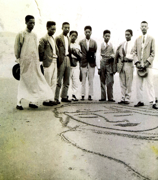 约1939年,稚英画室的同仁去普陀山旅游,在海滩上留下观音像合影,左起:金雪尘、吴信孚、凌旦复、宋允中、杭少英、李慕白、王文彦、杭稚英。