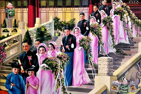 像《双考而夫》这类作品,更像是推广某种理念的招贴画,杭稚英笔下的这类作品还有《跑马厅女郎》《集体婚礼》等。这些作品有一个特点,即都有同景照片,也即这些月份牌大致是根据照片再改画的。杭鸣时晚年曾回忆:“上海王开照相馆出了一本老上海婚纱照的书,里面有各种各样及中西合璧的结婚照片。有蒋介石、宋美龄的,有杜月笙和他夫人的,还有很多新人的集体结婚照,包括我父母的3张婚纱照……我父亲曾经画过一张集体结婚的月份牌画,就是根据这家照相馆的集体婚纱照照片改画的。”