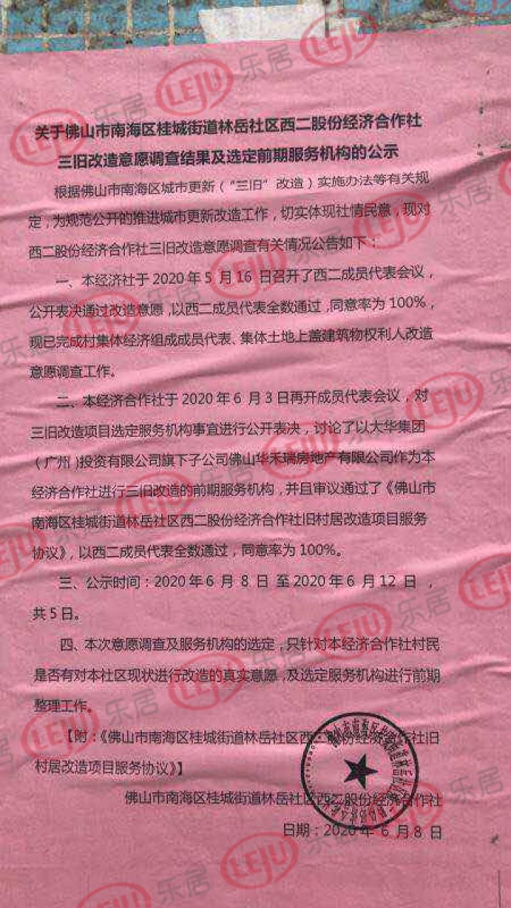 日前,乐居独家获悉,南海桂城街道林岳社区西二股份经济合作社发布一份三旧改造意愿调查结果及选定前期服务机构的公示,西二成员代表双双全票通过旧改意愿,以及前期改造项目服务协议。