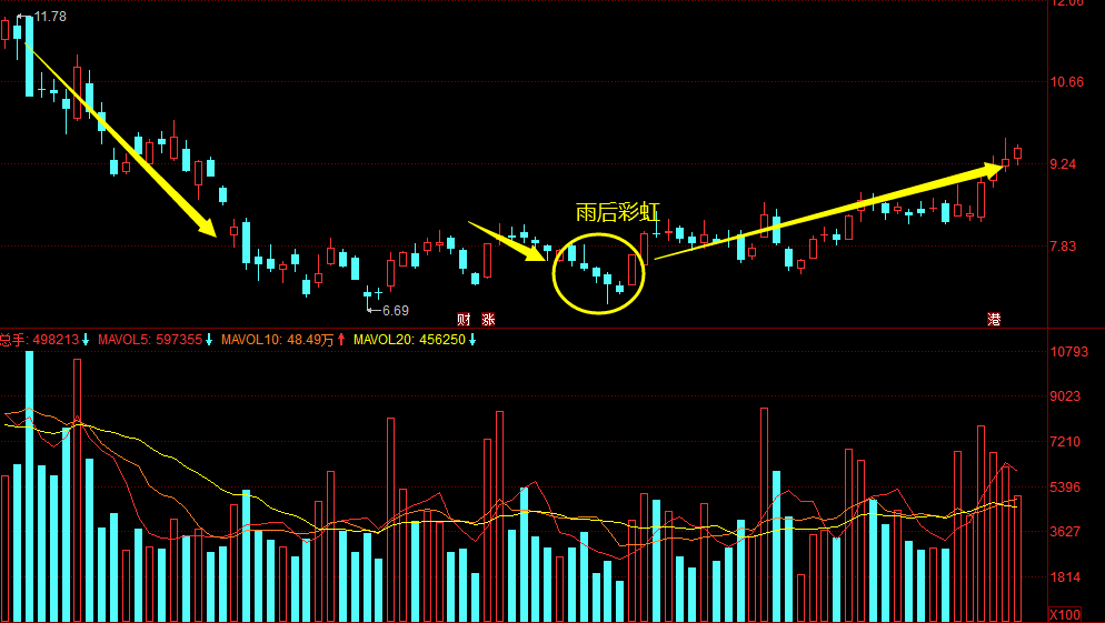股价经过一段时间的下跌后再度发生急跌,连续收出一系列阴线,成交量也出现地量水准,某天以一根放量大阳线阻断了下跌的趋势,就好像风雨过后的彩虹一样,是短线买入的信号。