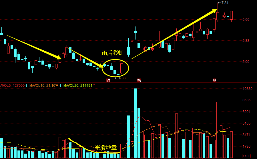 实例:飞龙股份2020年3月11日开始了一轮下跌,4月23日开始股价连续收出阴线,成交量也随着股价的回调而平滑地出现了地量水准,4月30日一根涨停放量长阳阻断了连阴走势,符合雨后彩虹形态,后市股价从4.91元一直涨到7.31元。