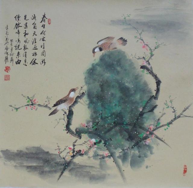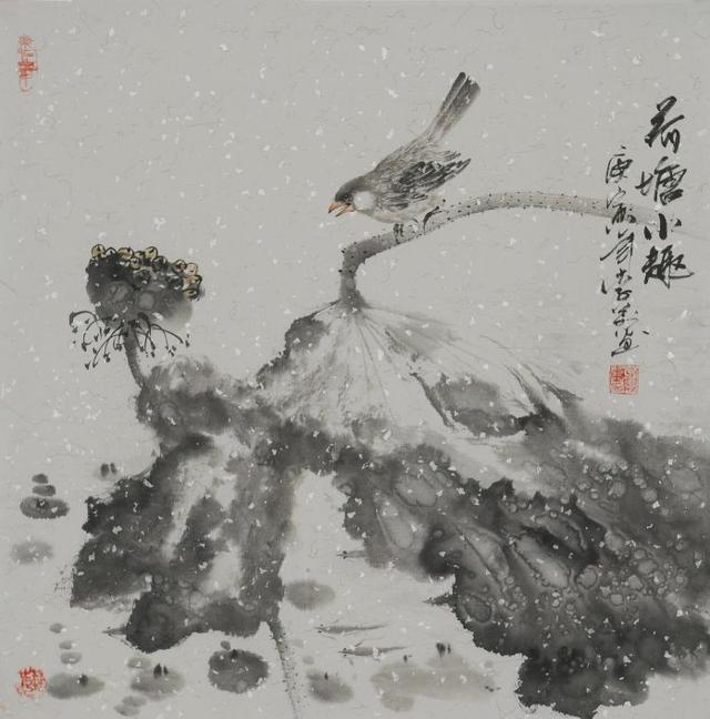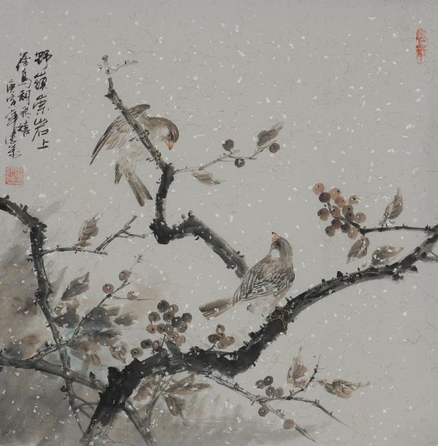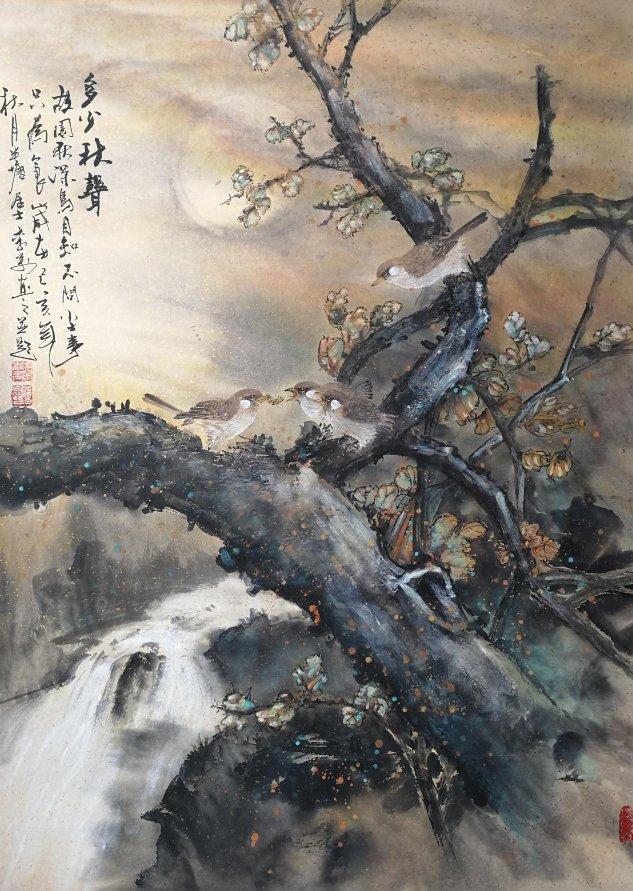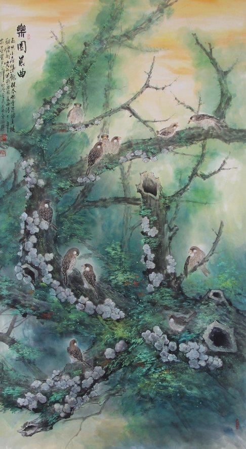 李万的雀鸟画活泼多趣,亦有国画之古韵,也有现代审美之创新“野岭崇岩上,苍枝竹荷间,雀鸟翻飞嬉,远去尘嚣喧”,是对他雀鸟画的生动写照。