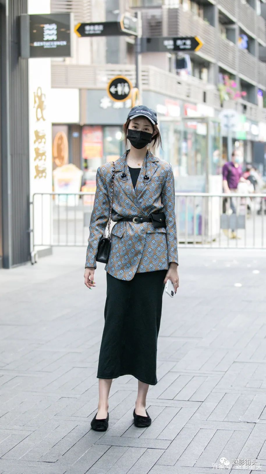 这个美女的穿搭有点混搭的味道,头上戴一顶棒球帽,夏天出门的时候,很多女生都会选择棒球帽,长长的帽檐遮阳效果非常好。美女还用西装外套来搭配连衣裙,这种穿法就是典型的混搭方式,西装的潇洒帅气配合连衣裙的优雅,帅气与妩媚并存。腰部系一条细细的黑色腰带,腰带上还有一个腰包,不仅是装饰,还可以放钥匙和手机,非常方便。再看美女的鞋子,一双黑色丝绒面料的平底鞋,良好的舒适感非常适合逛街的时候穿。