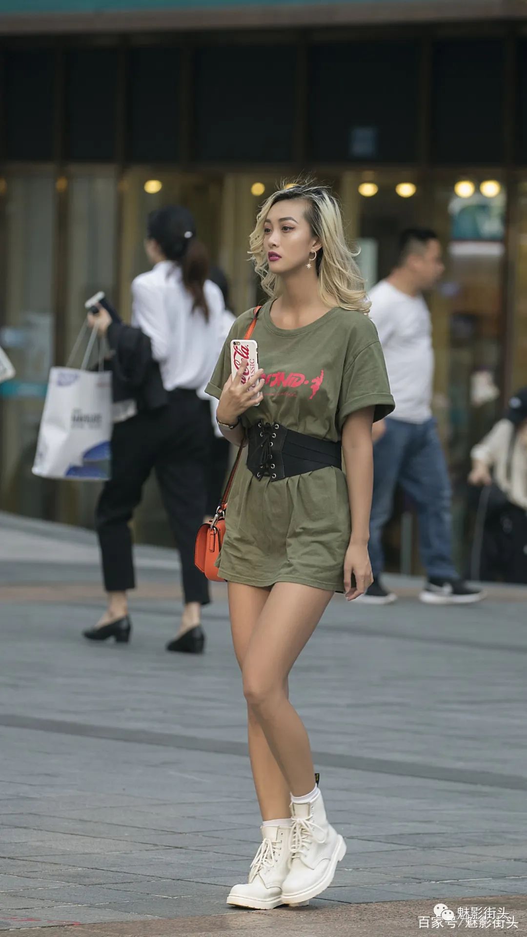 下装消失是很多女生都喜爱的搭配方式,最大的特点就是显腿长。这个美女的下装消失很简单,一件墨绿色的长款短袖T恤盖住了短裤,这样从视觉上会显得腿比较长。美女在腰部系了一条黑色腰封,腰封具有非常好的塑身效果,很多女生会选择外穿型腰封来凸显自己的个性魅力,做到了一举两得的效果。美女搭配了一双白色马丁靴,让美女看起来又飒又美,而且还风度翩翩。