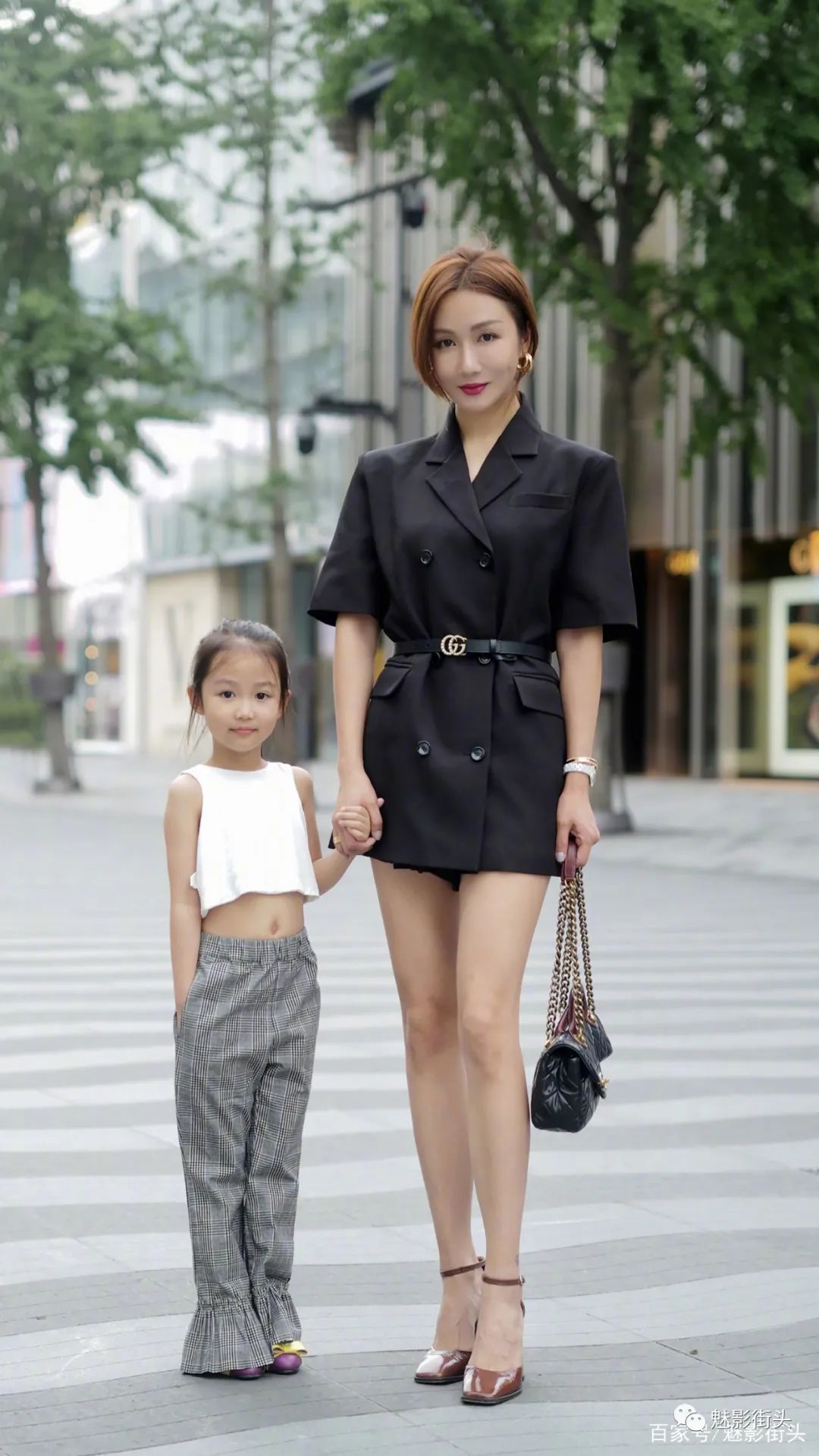 带着闺女逛街的时尚辣妈,身材和气质真的没话说,不仅漂亮还透着满满的精致感。小女孩的穿搭也非常时尚,选择了露脐装。辣妈选择了一款黑色长款西装外套,五分手袖设计带来了清凉舒适的效果,经典的西装领、双排扣设计,显得非常精神。腰部系一条黑色腰带,金色的腰带扣凸显品牌效用,勾勒出小蛮腰、重新划分身材比例,而且还是下装消失的搭配风格,再用一双棕色高跟鞋来衬托出长腿效果。这样的时尚辣妈,同样可以做一个迷人的“小妖精”。