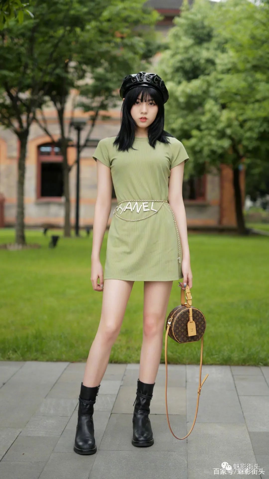 在炎热的夏天,选择服饰的时候,可以考虑一些冷色调的颜色,这样看起来会更加凉爽。比如这个美女,她选择了一条牛油果绿色的T恤裙,头上戴一顶皮质贝雷帽,凸显了小女生清新唯美的气质。腰部系一条金色腰带,大量的英文字母做装饰,凸显了品牌效应。腰带的加入营造出完美的身材比例,腰也显得更细了。美女搭配的鞋子是一双黑色马丁靴,表现大长腿的效果不错,这就是提升腰线以后的魅力。美女手上拎着一个圆形单肩包,这身搭配满满的高级感和品牌效应。