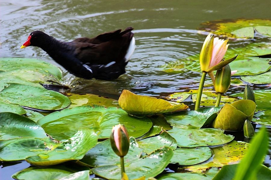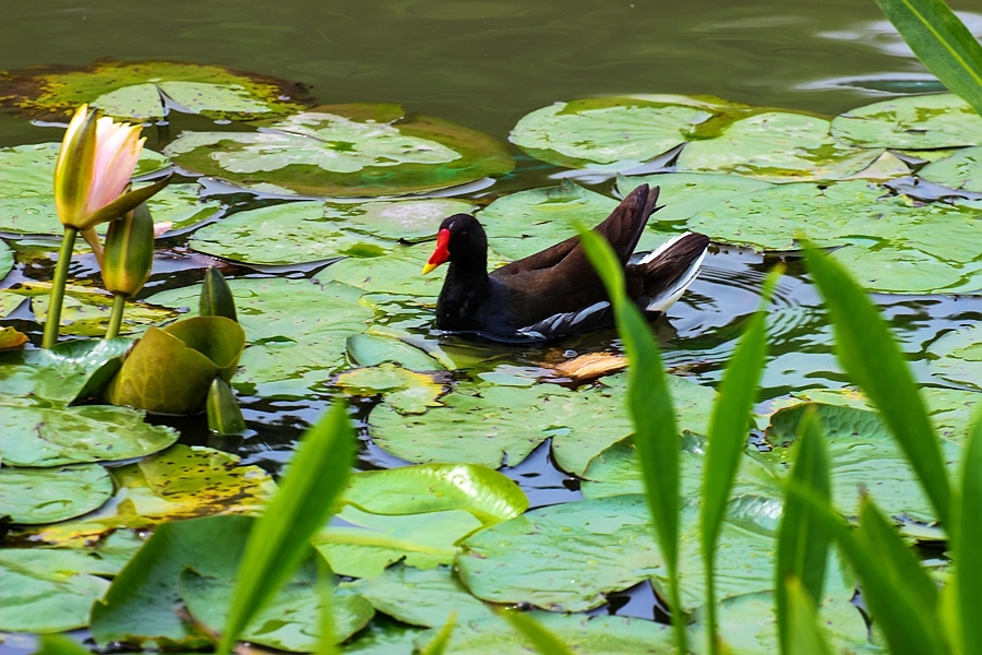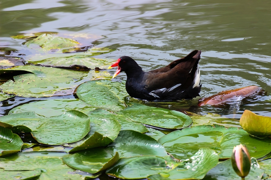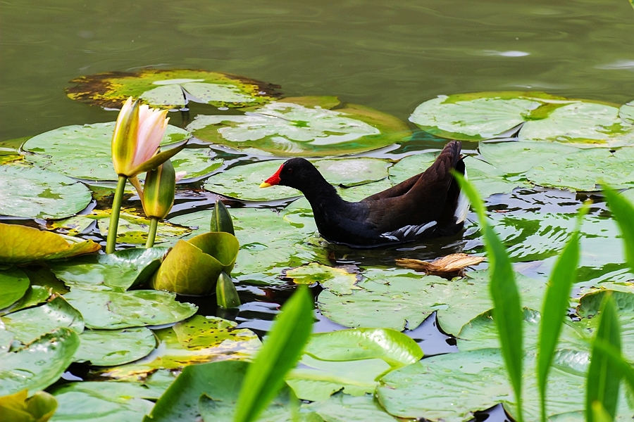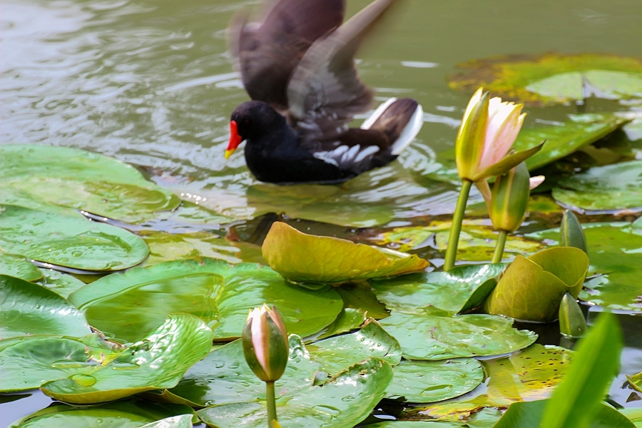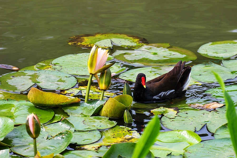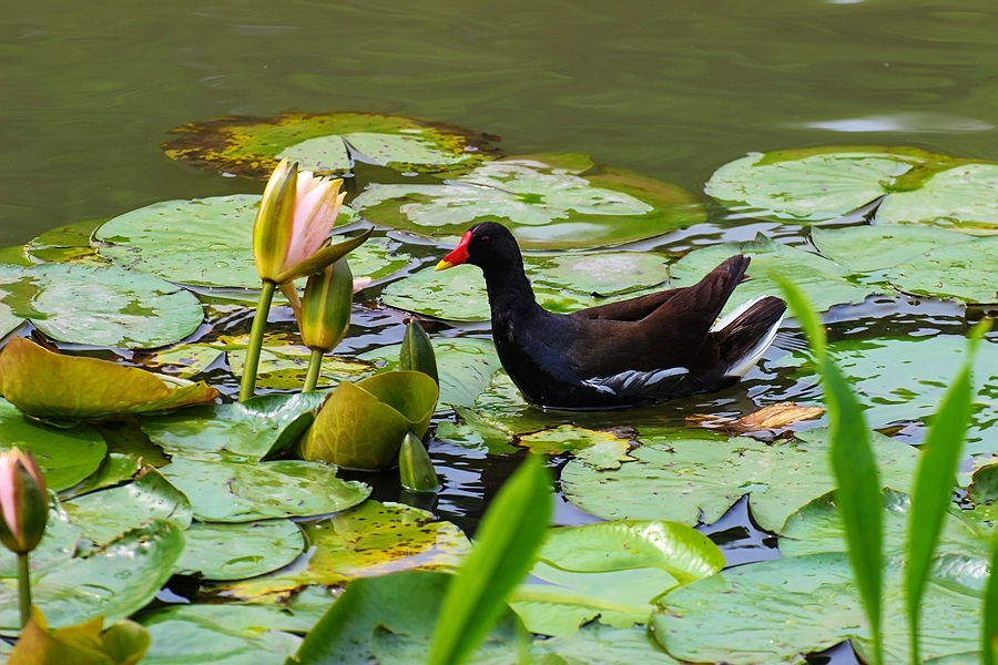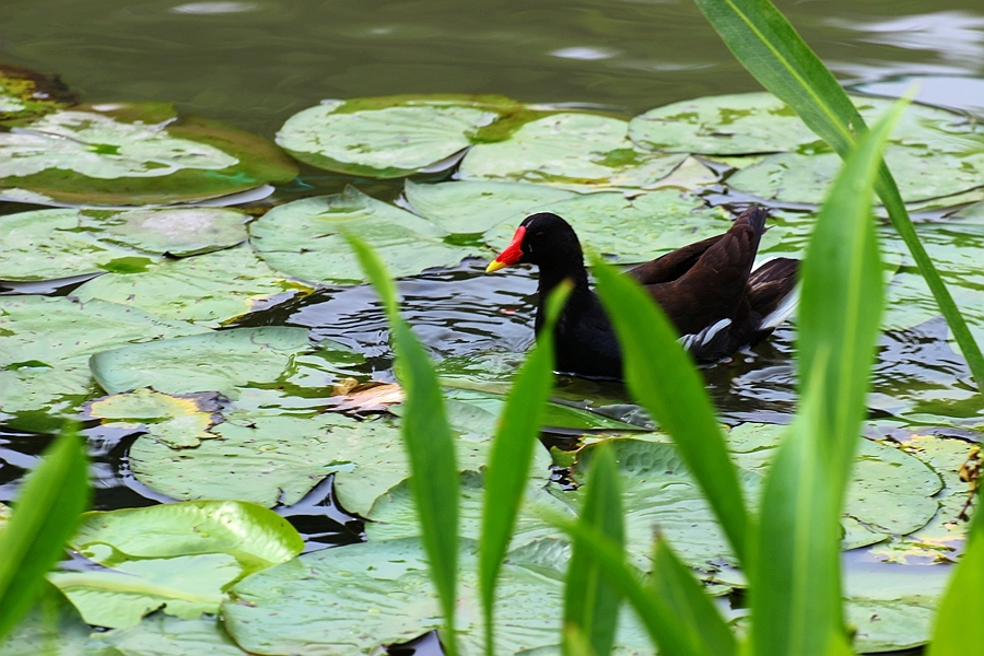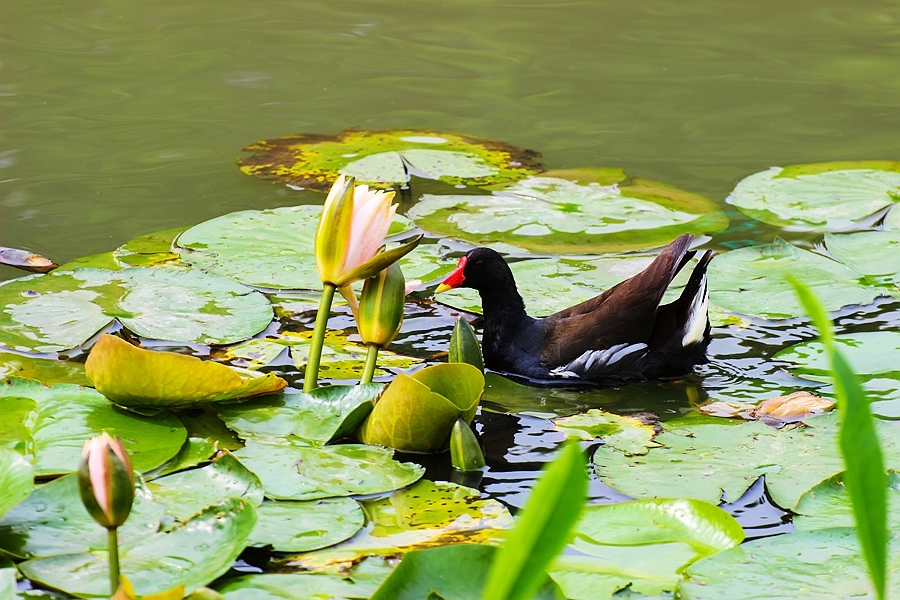 黑水鸡胖嘟嘟的,全身羽毛乌黑,它们的翅膀上有几撮白毛,嘴红色,嘴尖端黄色,色彩鲜艳,双脚淡黄且长,像两根木质筷子,两个脚丫巨大无比,它们就是靠这一对大脚踩在莲叶等水生植物上,而不会一脚下去压强太大掉进水里。