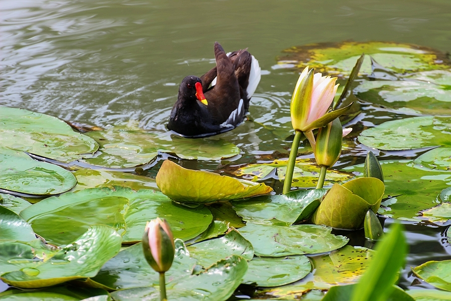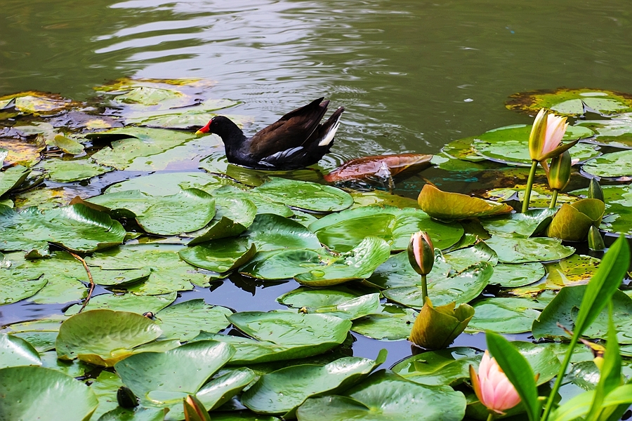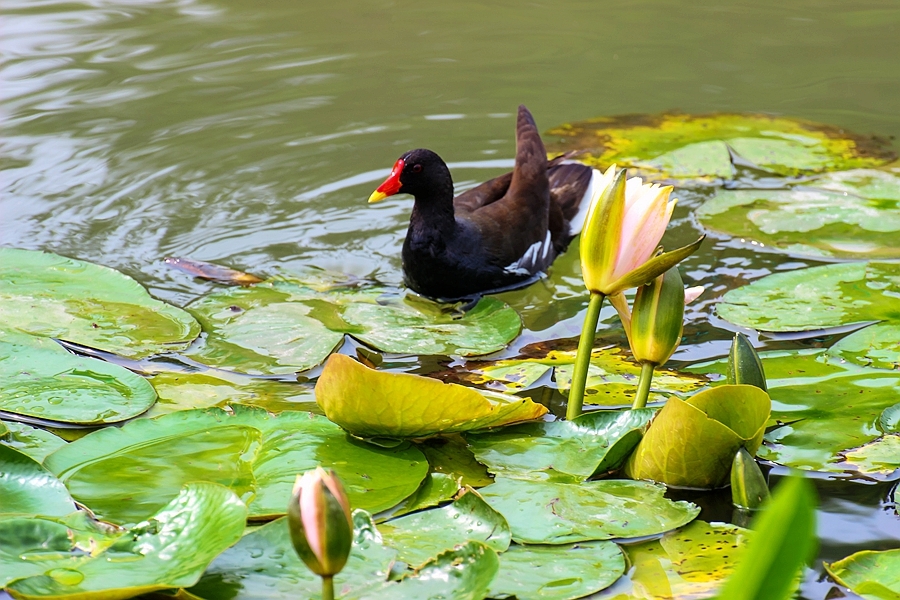 盛夏来临,上海闵行文化公园的一个湖里,满是莲花的盛开,非常惊艳。优美的环境吸引了几只远道而来的黑水鸡,来此戏水栖息。鸡戏水的场景,也引得过往游人驻足围观。