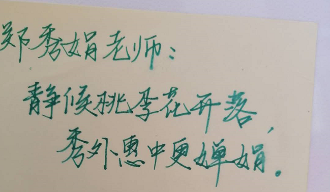 “郑秀娟老师:静候桃李花开落,秀外慧中更婵娟。”