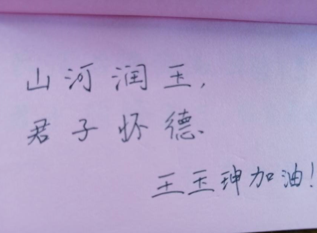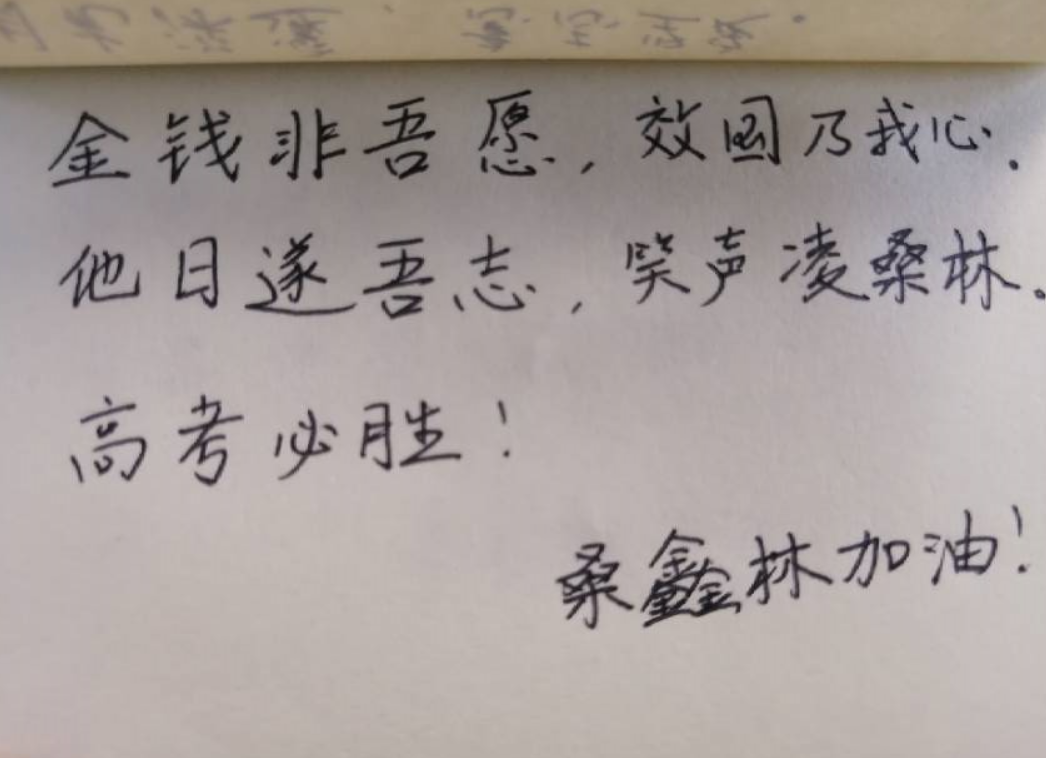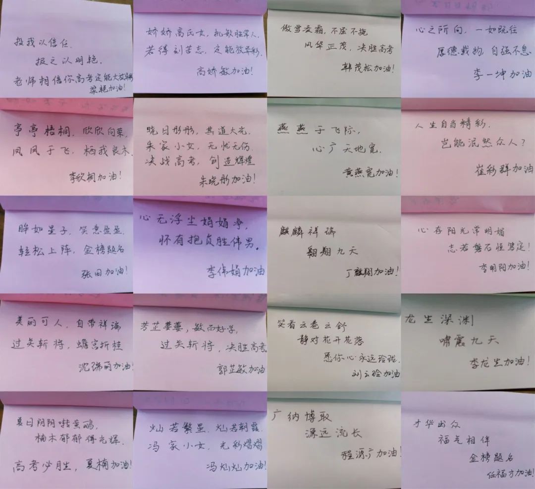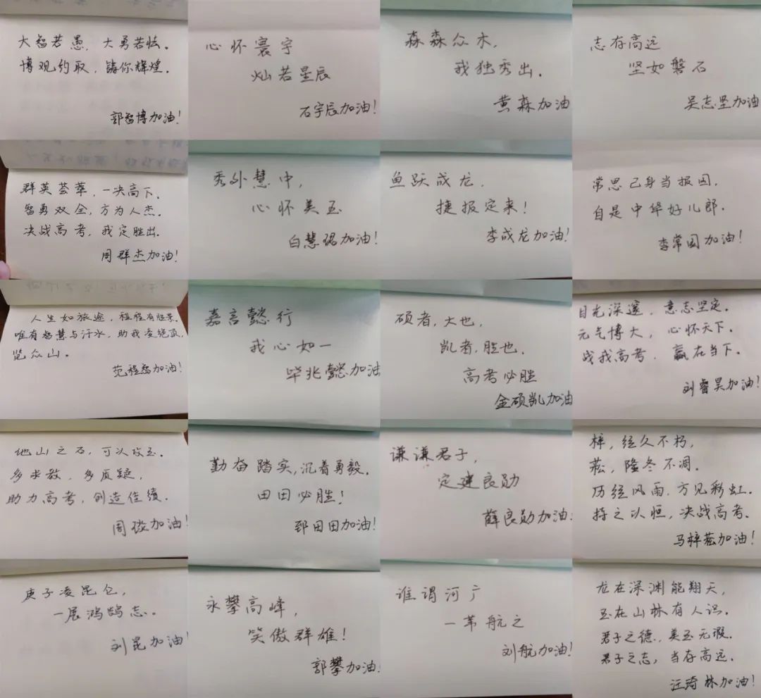 “梓,经久不朽。菘,隆冬不凋。经历风雨,方见彩虹。持之以恒,决战高考。——马字菘加油!”“大智若愚,大勇若怯。博观约取,铸你辉煌。——郭智博加油!”“心存阳光常明媚,志若磐石恒笃定。——李明阳加油!”
