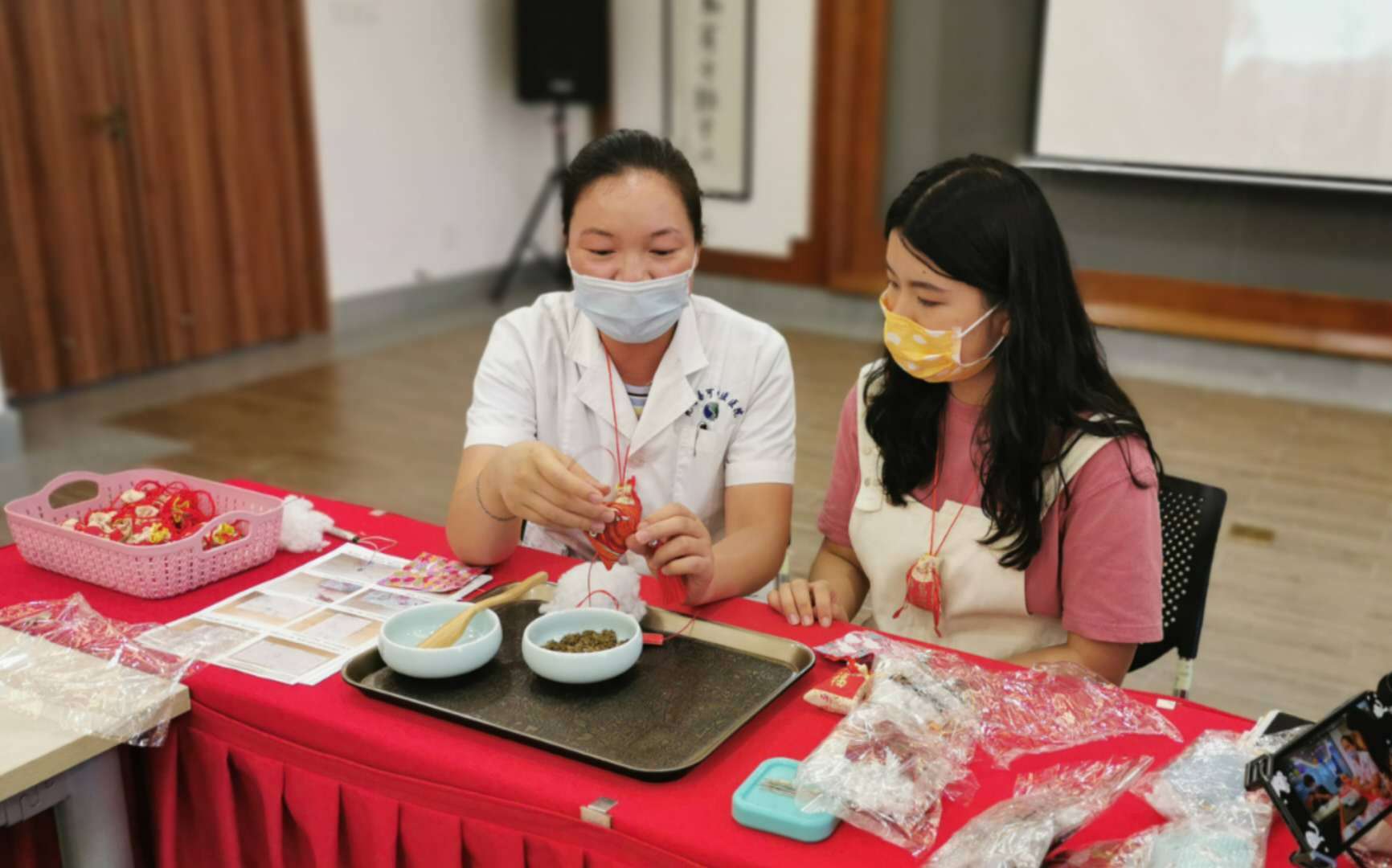 随后在制作防疫香囊环节,王杰主任为大家佩戴防疫香囊,刘巧云主任带着大家一起做香囊。本次香囊是由魏江磊教授开的防疫香囊,戴在身上,挥发性药物随气血经脉的循行而遍布全身,可开泄腠理、活血化淤、宣畅肺卫、避秽解毒、醒脾开胃、清热燥湿。据悉,2003年魏江磊教授曾作为中医代表参加了上海市的抗击非典疫情,取得了突出的贡献。
