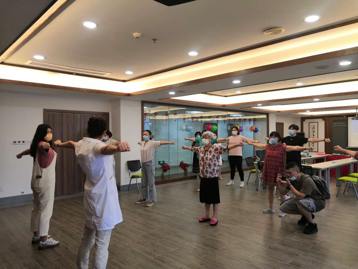 针对当前的疫情,筋伤中心主任王杰将古本易筋经“韦陀献杵第二势和收势”教给大家,这两势可补肺健脾。在七楼多功能厅,网友朋友认真学习易筋经的动作,当获知易筋经每一势都引导不同的经筋,通过伸筋拔骨、吐故纳新、守中致合,可达到强筋壮骨、固摄精气,濡养脏腑,涵养心性效果,网友都纷纷表示有时间一定要来易可完整的学习。