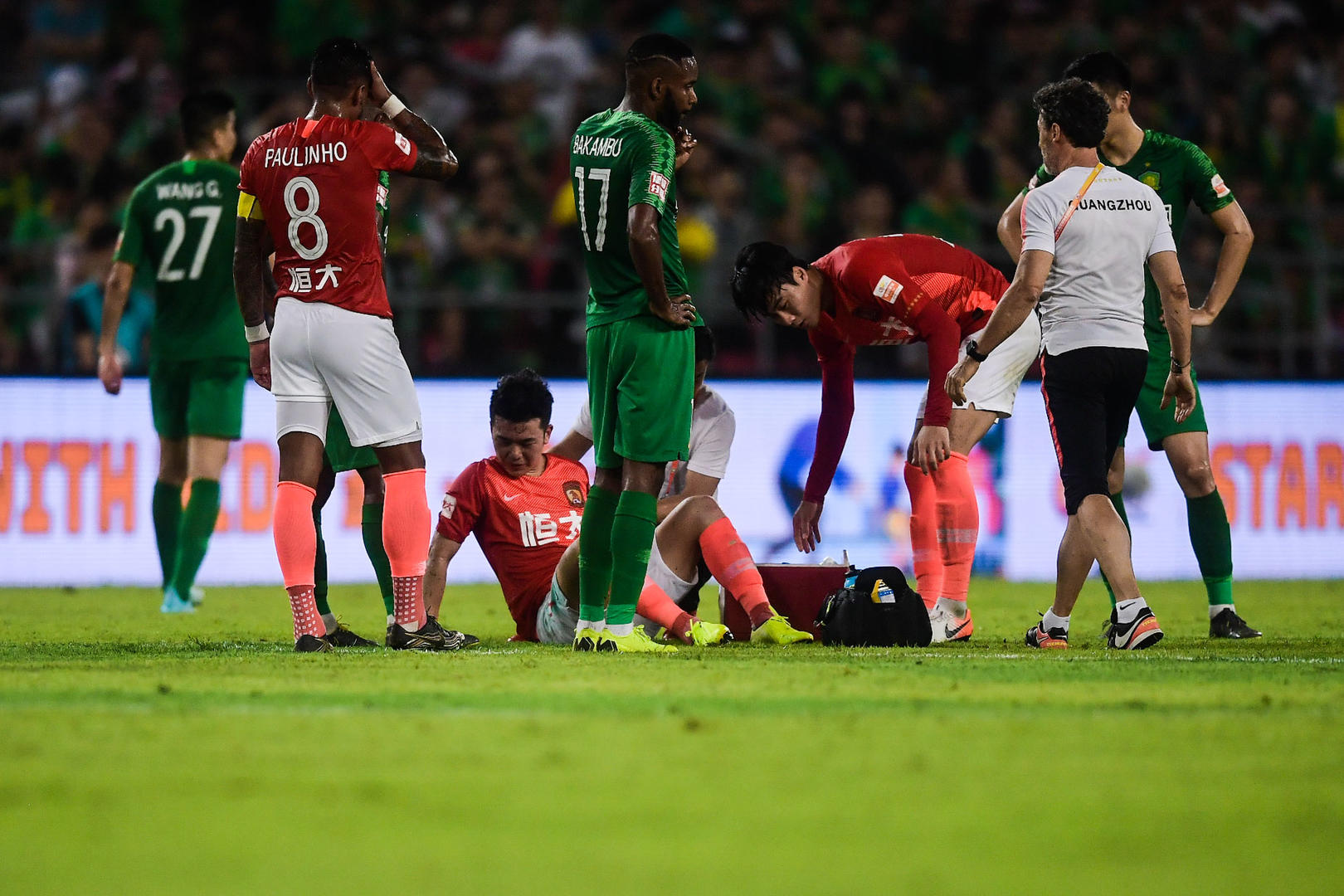 ▲2019年8月11日,北京,2019中超联赛第23轮,北京中赫国安VS广州恒大淘宝。严鼎皓受伤倒地。图据IC Photo