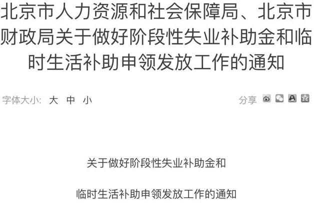 北京市人力资源和社会保障局、北京市财政局印发《关于做好阶段性失业补助金和临时生活补助申领发放工作的通知》,通知自7月1日起执行。