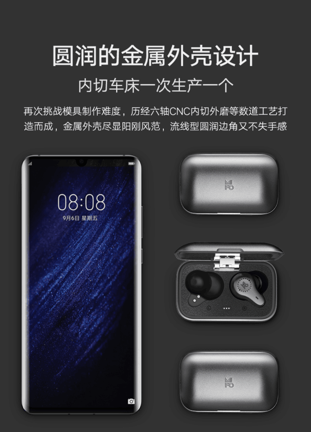 mifo魔浪是个运动耳机品牌,虽然是百元级的耳机,mifo魔浪O7产品包装逼格还是不低的,O7的电池舱采用全金属材料,舱盖挺有设计感,开合方式仿飞船舱设计,打开后会有些悬浮感,整体盖上后十分圆润触感也还可以,开会时无处安放的手有的一盘了;
