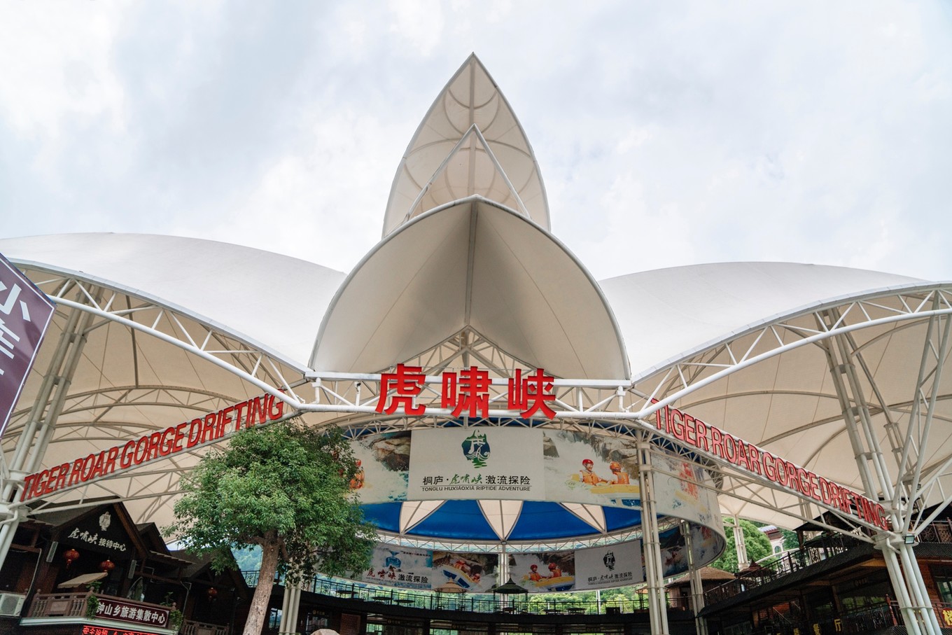 首先我们来到的是虎啸峡漂流的游客中心,做为漂流类型的季节性景区,虎啸峡的游客中心可谓是大气磅礴,毕竟是斥巨资所打造的,大型的钢构架顶篷,白色打底,从远处看甚至还有点 悉尼 歌剧院的感觉,满足了采光的需求,同时又能遮挡夏天的强烈阳光,保持四周通风,在这下面休息也是非常不错的。游客中心的前面是景区停车场,上万平米的面积,可提供六七百个停车位,完全满足自驾、团队游客的停车需求。