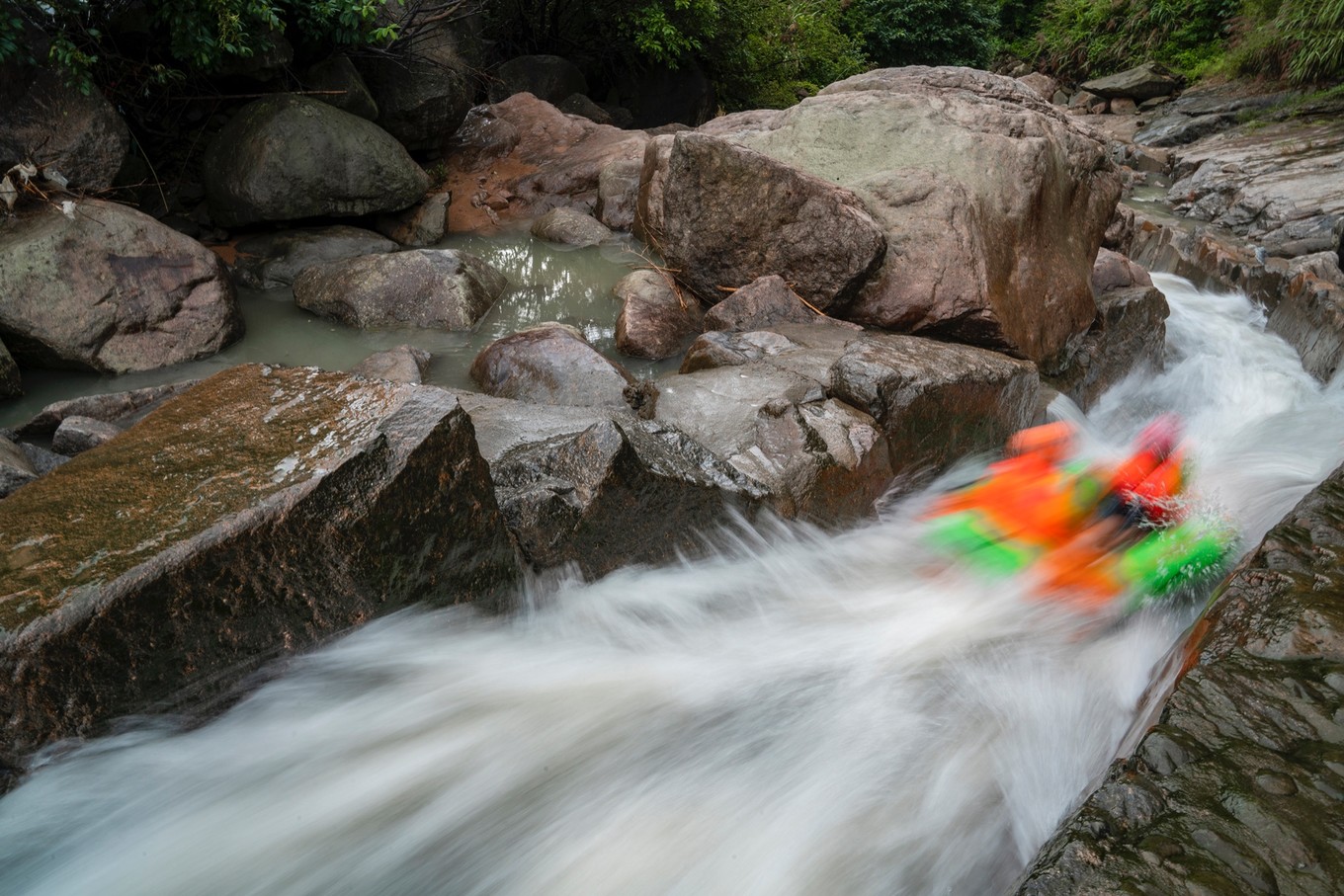 立马又是一段湍急的速降,简直就是一波未平一波又起啊,飞溅的水花伴随着天空中的尖叫声,漂流的魅力就是这样的有趣。整个漂流全程有数个这样的急流,每一次都是充满着激情,无法预知河道前方的情况,可能转角处就是惊喜,这也是玩漂流的刺激所在。