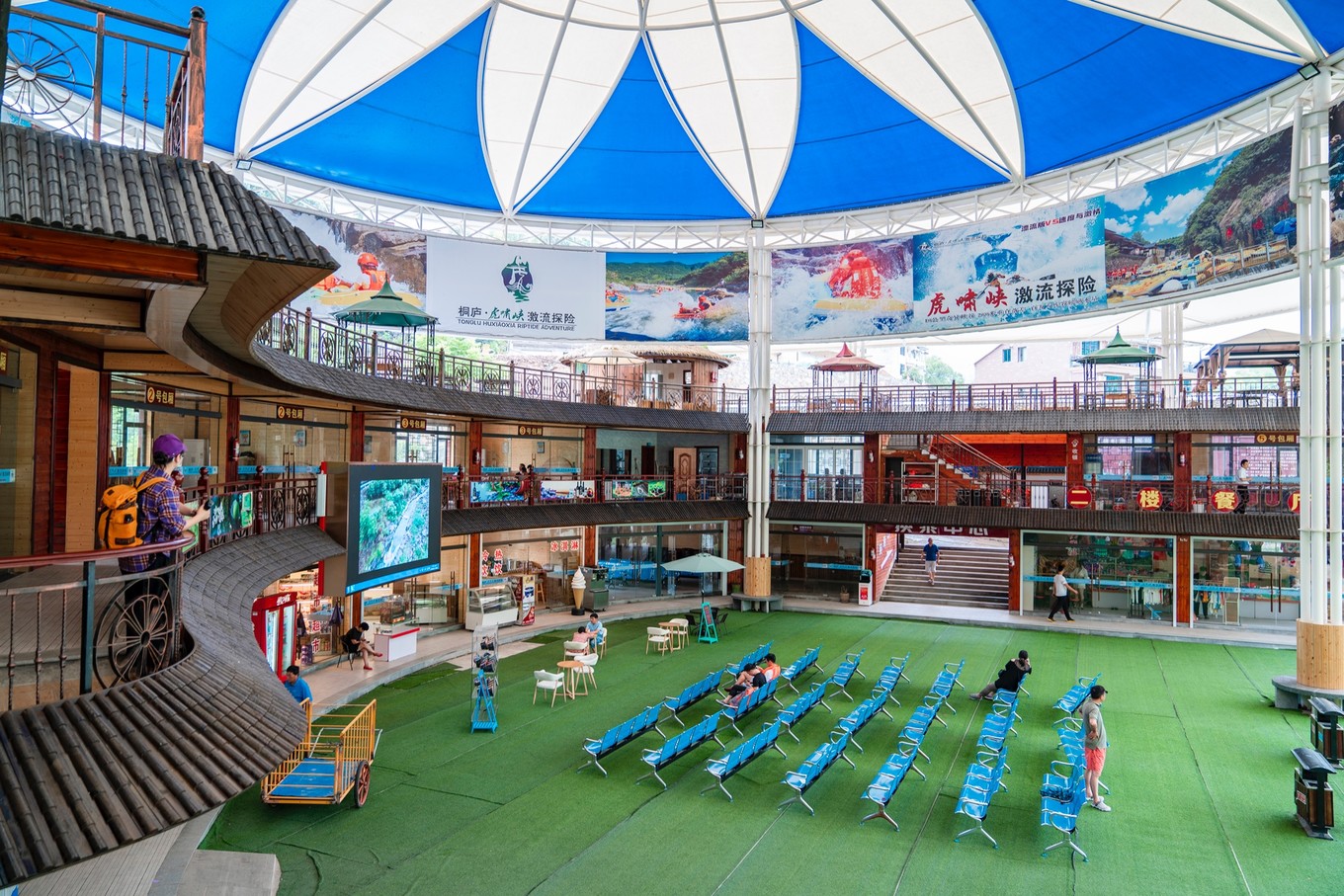 游客中心分三层,一层是大厅休息区域,同时也是主要的功能区域,提供售票、咨询、寄存、洗浴、有偿吹发、医务等等服务,同时还有商店和餐厅,二楼和三楼是餐厅和休闲茶吧,漂流等待之余在这里坐坐也是非常不错的选择。