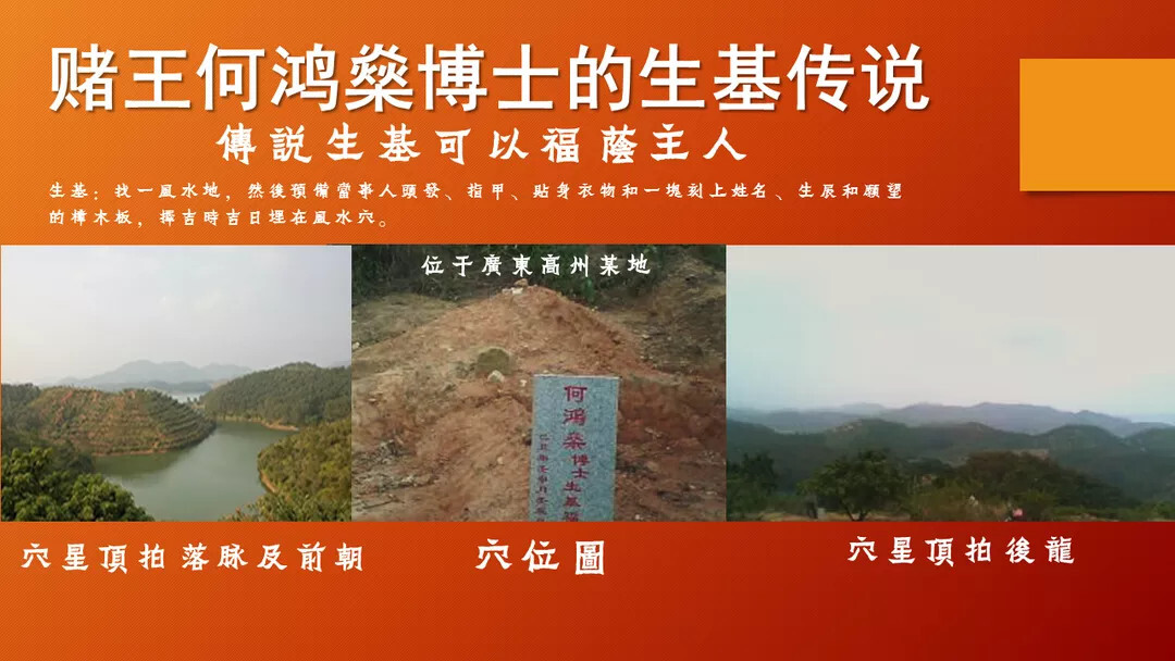 生基穴很难去,用舢舨横过水库,然后再徒步走上山顶,经过大半个小时,赫然见到荒土上竖起一块碑石,大小约一呎乘两呎半,上面刻有“何鸿燊博士生基福地”字样,碑上的日期亦显示生基是“己丑年壬申月壬辰日立”,即己丑年的八月十五日,正是何中风后的第十八日。