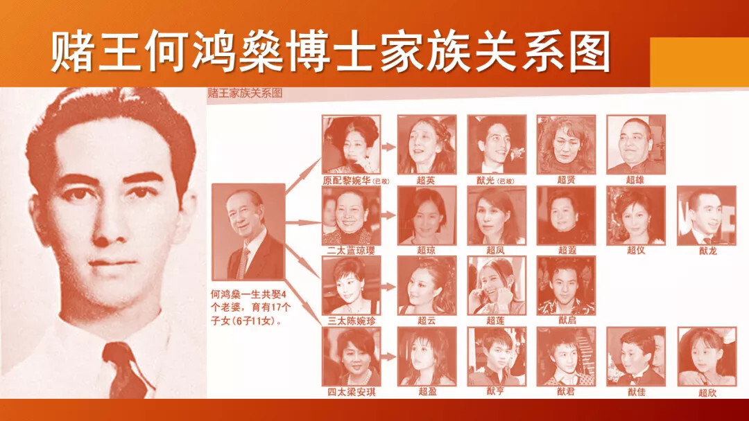 现在最著的就是何鸿燊先生,子女17个,是澳门历史上权势最大,获利最多,名气最响,在位时间最长的赌王。