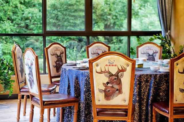餐厅建筑大幅度采用做旧的原生态木桩,远远望去,被茅草、绿植覆盖的木楼,完美地与古龙峡的森林融为一体。