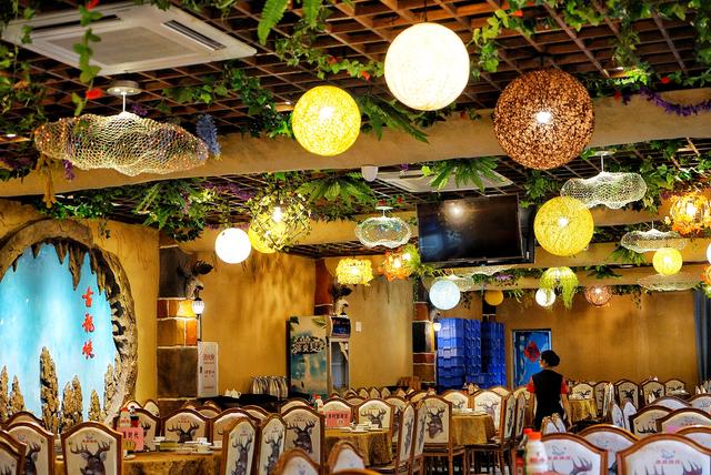走廊里挂着清雅的红灯笼,包房里用的是高级西餐厅里爱用的动物靠椅,墙壁上挂着艺术的吊花,混搭的装修,带点唐风,拍照蛮有韵味的。