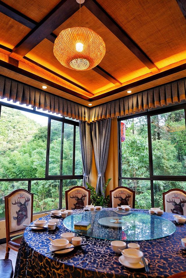 站在二楼的包房里,玻璃窗外都是郁郁葱葱的山林,推窗可见山见水,并独揽网红桥的全貌。