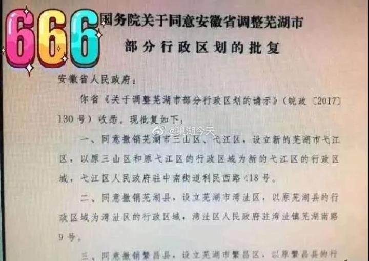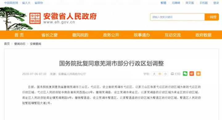 7月6日,安徽省人民政府官网发布消息《国务院批复同意芜湖市部分行政区划调整》。