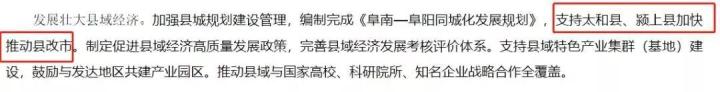 阜阳市在2019年国民经济和社会发展计划草案与重点工作中,政府明确表明:2019年支持太和县、颍上县加快推动县改市。