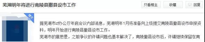 有消息称,芜湖市政府办公厅2019年年底会议内部消息透露,芜湖将于2020年1月提交南陵县撤县设市申报材料,逐步开始南陵县撤县设市工作。