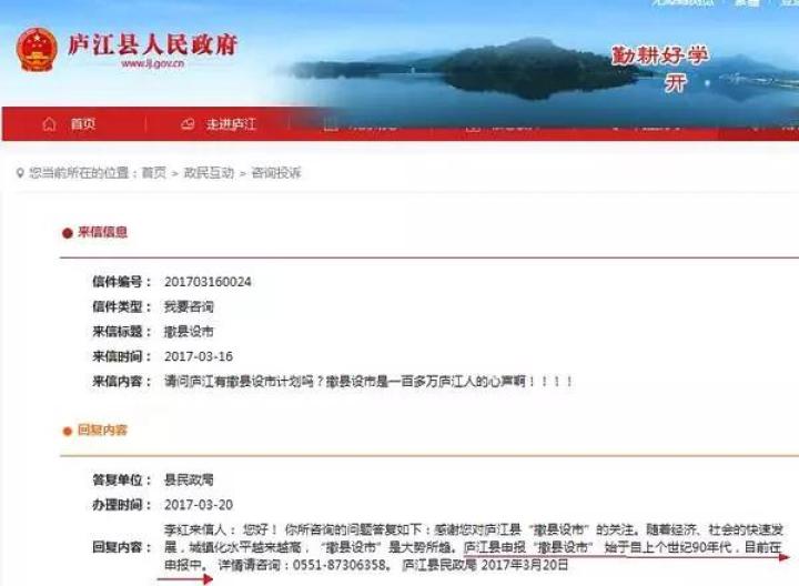 早在2017年年初,庐江县就开始进行“撤县设市”的申报工作,在庐江县政府网站上,不少市民向庐江县政府询问撤县设市的进程,县民政局回复:目前在申报中。