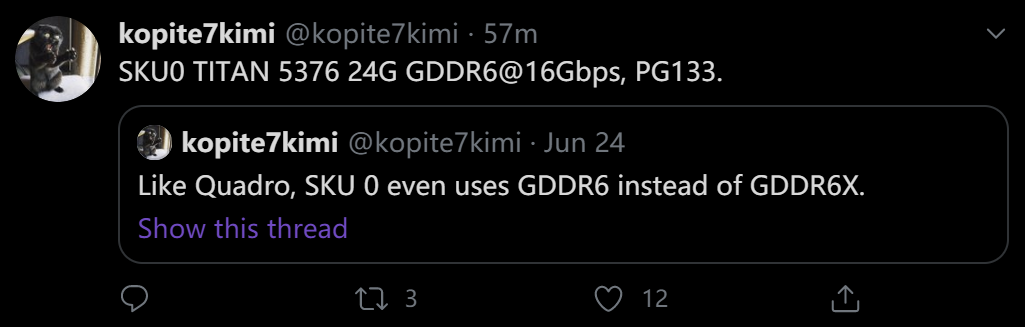 另外,他还公开了新一代TITAN的最新规格,它的24GB显存大概率是等效频率为16Gbps的GDDR6,而不是更高频率的GDDR6X。