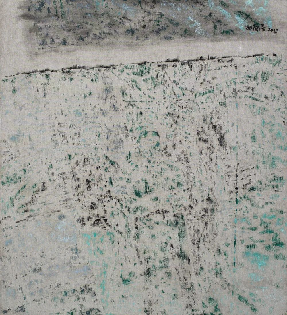 The “Postcard” series (2015) continues to draw connections to the China Artists Association landscape painting project, further exploring this formalist definition of the landscape through a storyline of the abandonment and concealment of a task, a disheartening ending, and a fruitless effort. In this series, the artist’s “canvas penetration” technique treats the excess traces of seeping paint as the smallest unit in a multifaceted research on the imagination of the absence of information in visual games, and insights drawn from theories of “staining” in painting.