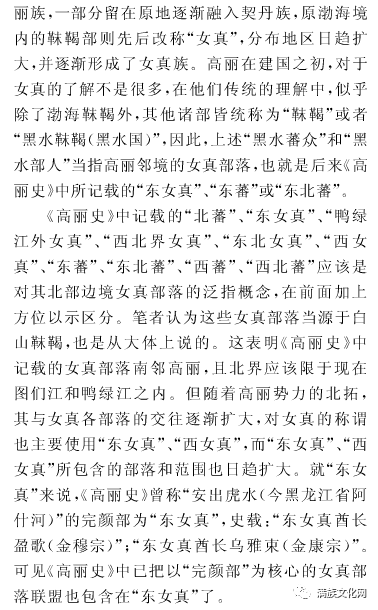 女真族属于中国东北古代肃慎族系,在中国文献中先秦时代称肃慎,两汉三国时期称挹娄,后魏时代称勿吉,隋唐时代称 靺 鞨 ,宋代称女真。高丽建国后将女真人称作“黑水蕃众”、“黑水”部人、“北蕃”、“东女真”、“鸭绿江外女真”、“西北界女真”、“东北女真”、“西女真”、“东蕃”、“东北蕃”、“西蕃”、“西北蕃”,现将《高丽史》中对女真的称呼摘录如下: