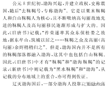 女真源于 靺 鞨 ,我国古籍多有记述,《金史·世纪》载:“金之先出 靺 鞨氏”。然而靺鞨分为诸部,他们分布的地域很广阔。这里所说“隋唐间为高句丽所并”者,主要是指白山 靺 鞨,他们分布于长白山及南脉盖马大山东西一带。《旧唐书· 靺 鞨传》则载:“白山部素附于高丽(高句丽)”白山部指的就是白山靺 鞨 ,当高句丽并有朝鲜半岛北部地区后,白山 靺鞨 就已经附属于它,成为高句丽统治的部族,《三国史记》则称之为“靺鞨”。