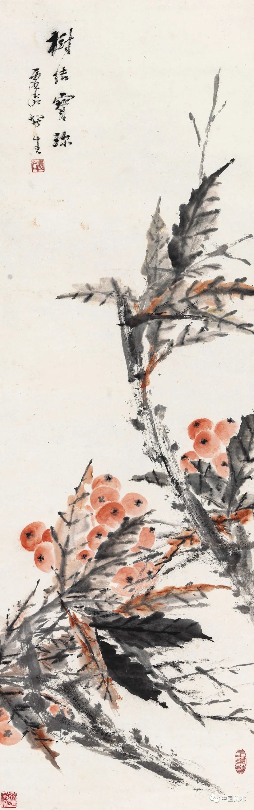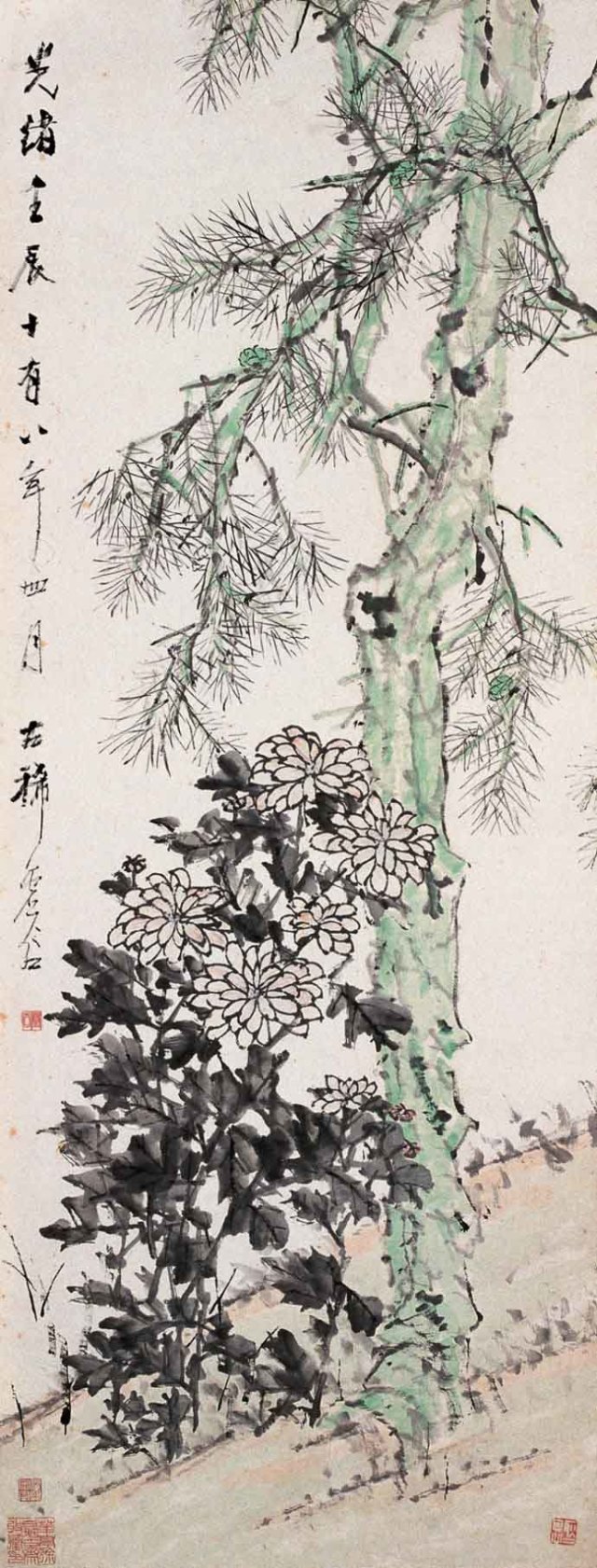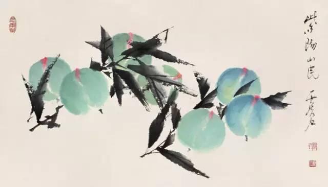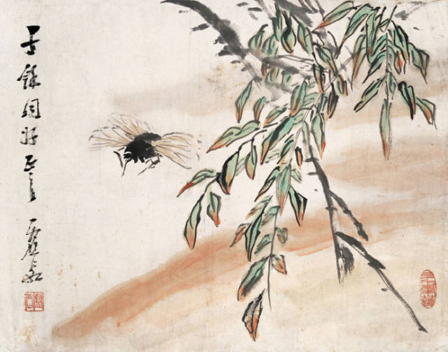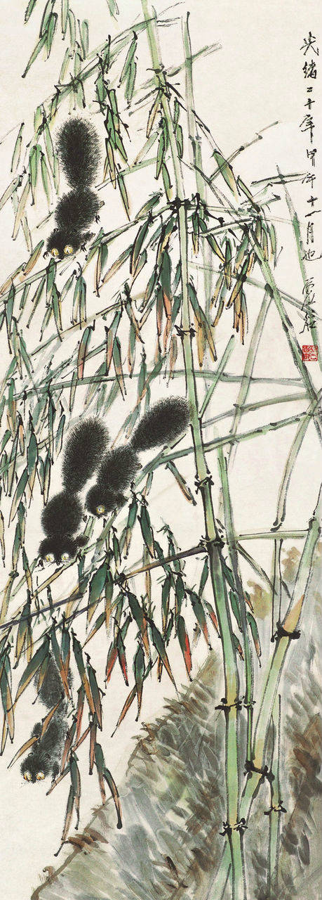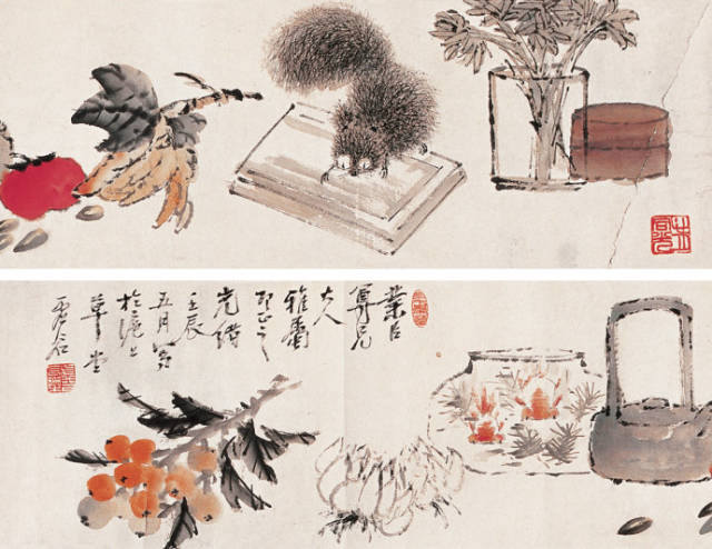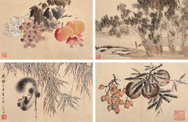 在伪作的款题中,每多生搬硬凑之迹。如“庚辰春月”、“庚辰夏月”之作,常见仿拼,宜其字少易为,故这类作品颇为增多。又如“桃实图轴”, (上海博物馆藏),款题“光绪己丑阳春写於沪城行馆,虚谷”,颇为有味,但此款被照抄到改头换面的另一帧“山桃图轴”中(中央美术学院藏),岂不令人捧腹?更有将虚谷静物蔬果也伪拼凑合成幅者,构局极不自然,且笔墨更遑论。虚谷之静物蔬果小册,几个水蜜桃,一串葡萄,或竹笋扁鱼之属,配置得都恰到好处,至不可栘易之境。其构局之美,之精,可比美西方之塞尚。有一次看法国莫奈故居博物馆藏品展,其中有未完之画稿,其油彩挥写,藤花春水,“Wisteria(1919—1920)”顿时如对虚谷之作,甚类花卉长卷,又似紫绶金章。故艺术之发展亦有内在关联,心灵呼应者,虽地处东西人类亦有其共感。这也反证虚谷作品境界之高,而作伪者是不可企及的。但这类以虚谷画中素材拼凑的,却亦是作伪一法,数量也颇为可观的。
