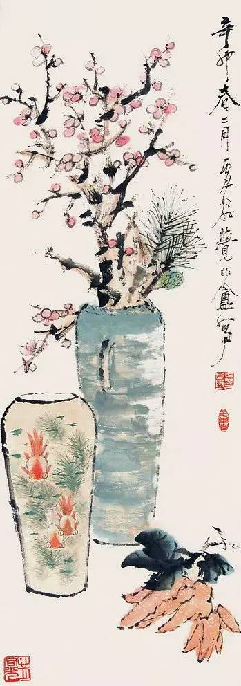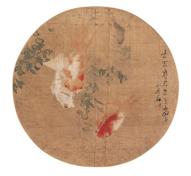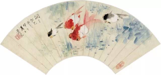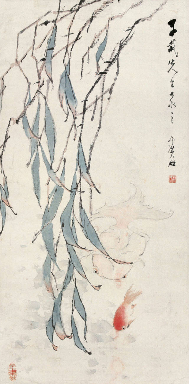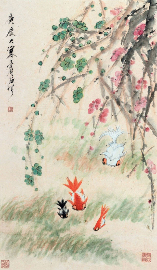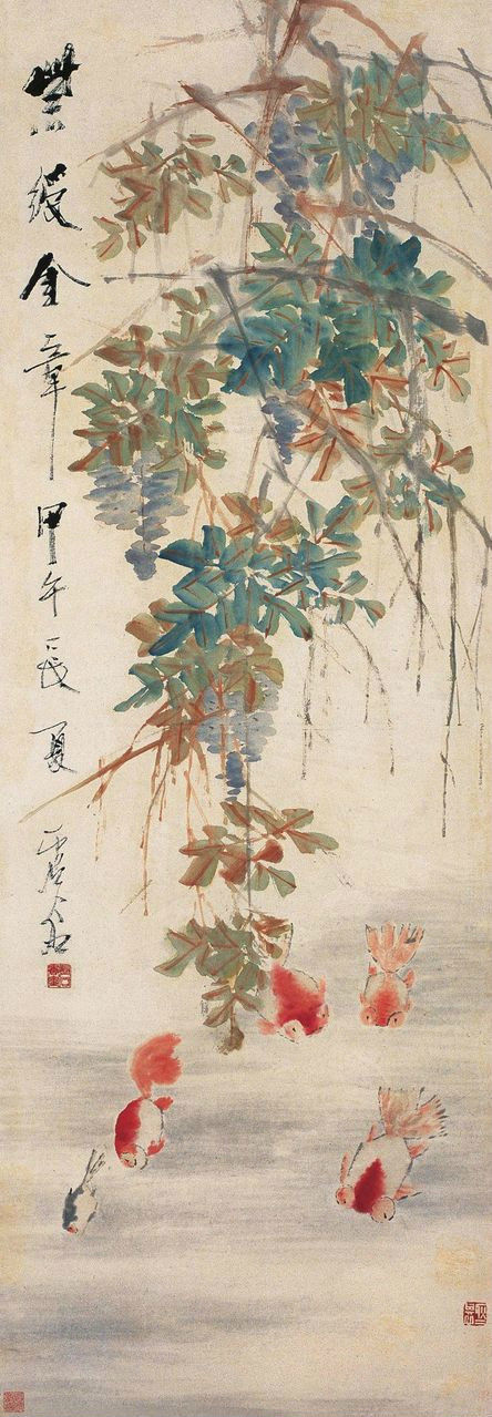 虚谷在题款中用“觉非盦”、“解弢馆”、“倦鹤”等语,也决非随意,而伪作又每喜用此类题语。再如“紫绶金章”,题於虚谷最後期一八九五年(乙末)之作品中,已如前述。但却见有"庚辰春月“(一八八0年)的一幅,差不多可以立即判明为伪作。”紫绶金章"传世见有五本,三本藏北京故宫博物院,一本藏上海博物馆,尤精,另一本在法国。此图之寓意,不过是借紫藤金鱼之色泽,写取春光融融之欢悦之境,意为亦如春藤金鱼也似的,已“解其天弢”无拘无束,一任天然、自由。这也正是虚谷追求的理想境界,实在与追求功名之“紫绶金章”原义颇为分驰,也与赠予何人之地位身份无多关系。否则,倒是忘却或曲解了虚谷之本来画意。或也如任渭长之画紫藤、锦鸡以题“紫绶金章”,任伯年以“黄卷青灯图”来题“惟愿取黄卷青灯,及早换金章紫绶”一样,不过是借此画题,也有半为吉利,半为解嘲之意。虚谷先曾画“兰花金鱼”、“梅花金鱼”,此後才画“紫藤金鱼”,而且先题以“春波鱼戏”,最後才题“紫绶金章”。有钱镜塘原藏一幅“舂波鱼戏”,仔细看,值得推敲。款题僵拙,梅花用笔不对,尤其金鱼之点睛,虚谷有独特之技,凡观金鱼,先看其点睛可也。