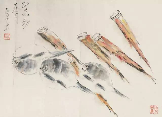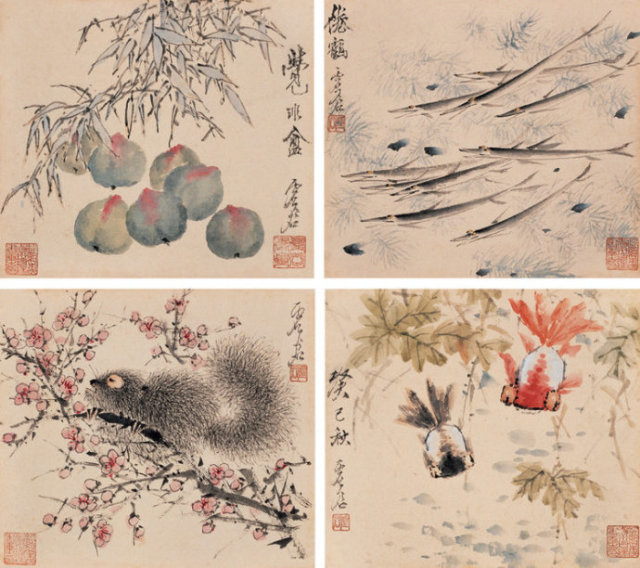 至於虚谷之册页,传世的几部,如一八七六年﹝山水册﹞(赠高邕之)、一八八一 (辛巳)﹝杂画册﹞(上海博物馆藏)、一八八三年(癸未)﹝山水册﹞(赠高邕之)、一八九一年(辛卯)﹝花果鳞兽册﹞(北京故宫博物院藏)、一八九二年(壬辰)﹝杂画册﹞(上海中国画院藏)、一八九三年顷﹝花鸟水族册﹞(南京博物院藏)和一八九五年(乙末)﹝杂画册﹞(上海博物馆藏),以上七部(最後一册为十开,其余均为十二开)都很精采。另有若干散页,因此传世并不为多。有一部﹝花果鳞兽册﹞十二开,仿同北京故宫藏一八九一年本,为江寒汀之临本,复由苏州灵岩山之僧寺转入苏州博物馆收藏。另有散页荷花、水仙、游鱼、大蒜扁鱼等册幅(现藏天津艺术博物馆),亦为江寒汀摹仿。观之江氏笔墨终多火气,而少静气,特别花瓣,叶尖焦墨交叉或淡墨交如浊点,习气太重。又江氏之款书,出笔锋气过露,又加粗重,时见僵硬做作,因此望之可辨。虚谷之伪仿,除江寒汀外,常见者仍有三四手,如细细辨别,应可理出其中线索。总之,伪仿作品之多少,也正从另一个侧面反证出这画家艺术之魅力及其作品的重要性。古往今来,概莫如此吧。