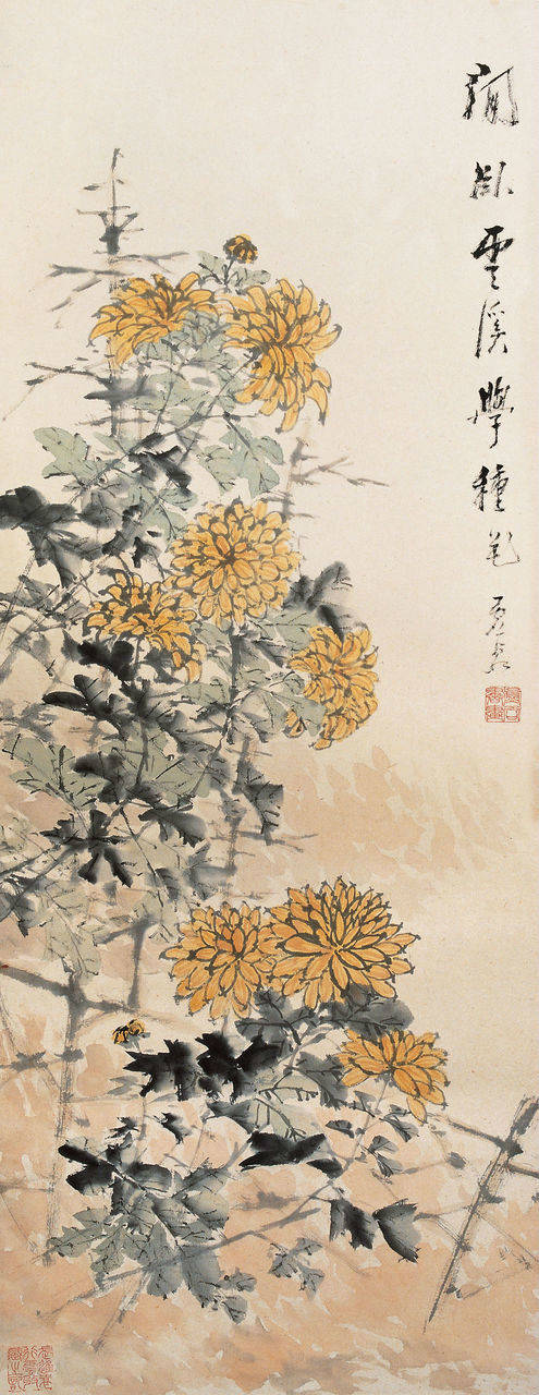 近代有靳鞠者,字丕天、勃天,室号崇虚弢,汾阳人。其嗜虚谷画可知,他收藏见十轴,九幅藏北京故宫博物院,一幅藏天津美术出版社。中有精品“观潮图轴”、 “葑山钓徒像轴”,他并於一九四三年癸末在“葑山钓徒轴”绫边题跋。在藏品上并钤有他的“汾阳靳鞠审定”、“崇虚弢鉴藏”(朱文和白文长印各一)、“崇虚弢”等收藏印。可惜有七件为伪作。其中如“菊花图轴”,画法极差,款题为“庚辰夏月觉非弢虚谷”,书法亦差,尤其“觉非弢”为虚谷後期画中始用(一八八八),此作为一八八0年。“桃花游鹅图轴”,用笔生造,全无章法。“山茶水仙图轴”,画得更是怪陋。另有多幅只用一 “舄”字小印者,如“松月图轴”、“鱼藻图轴”、“菊花轴”等,画法题款均有不称。也许因为此小印易刻,便於应付。其实如前所论,此“舄”字印为後期作品所用,且未见单独钤用,一般都需配以虚谷名章和其他闲章。特别是其意与“天空任鸟飞”相应,才更具意境。因此,凡是以“舄”字印,或以其他闲章单独一用,则应视为不合虚谷体例,再看其用笔、画法、题识,即可判明真伪了。