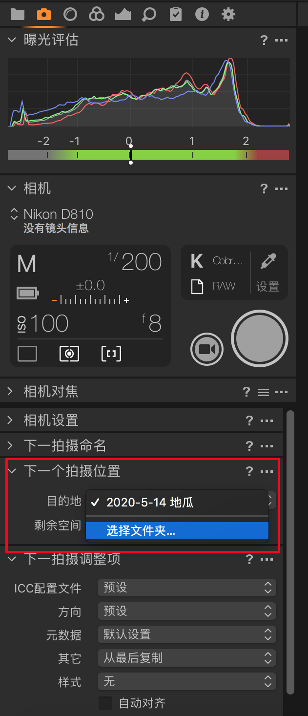 在进行拍摄前,需要设置图片拍摄后在电脑中的储存位置,这样你按动快门时,图片就直接存储到电脑中了。如图3所示,在“下一个拍摄位置”这个板块,点击目的地,然后选择“选择文件夹”。