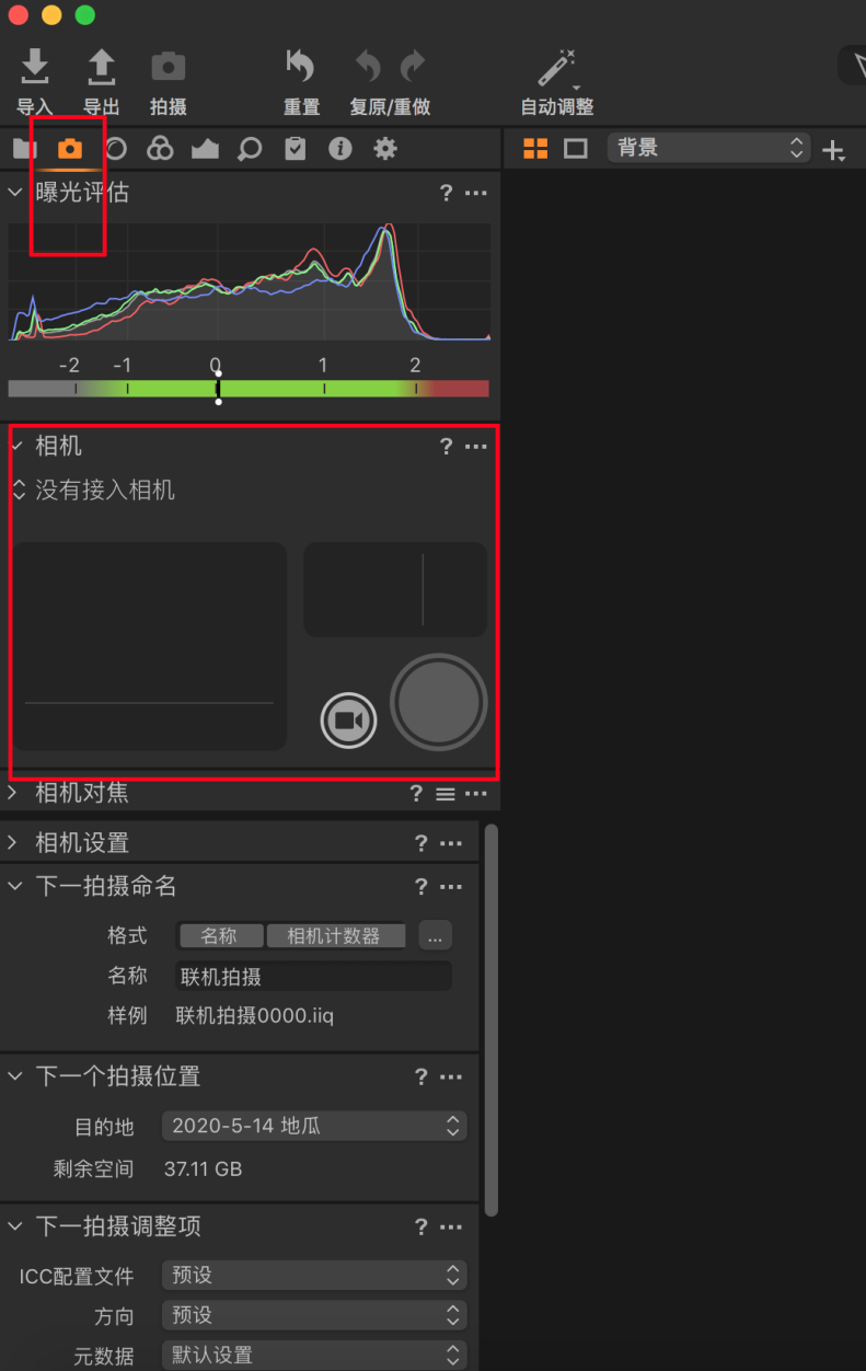 打开Capture one后,如图1,点击画面上方的红色方框内的相机图案,你会发现画面中部红框内显示没有接入相机。