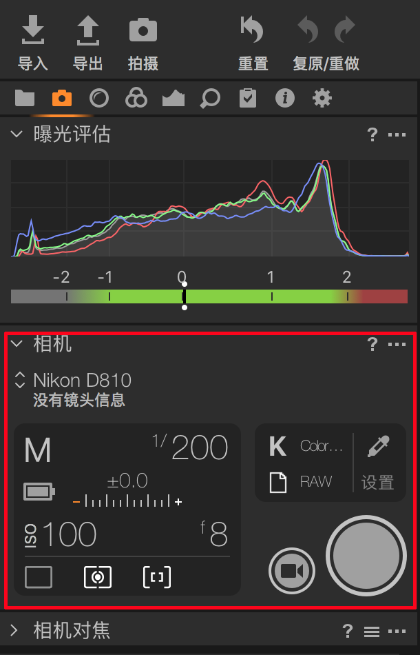 然后,开启相机,如图如图2所示,红框的位置就识别出了相机,包括你的相机拍摄的参数的设置,光圈、快门、感光度这这个参数都可以直接通过点击上面的数字来进行调节,非常方便。