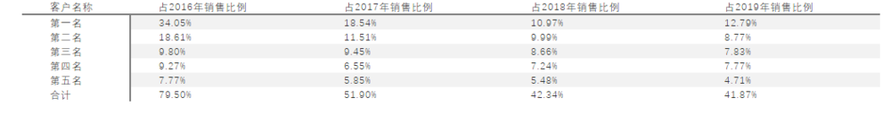 Table 22 前五大客户占比(2016~2019)。上市后调整报告方式,不再披露客户名称。