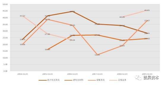 目前,动力电池是公司主要的毛利来源,2019年的毛利占比约83%,其次为锂电池材料,占比约10%。当前其储能系统还处于发展初期,营收仅为6.1亿元,约占公司总营收的1%。