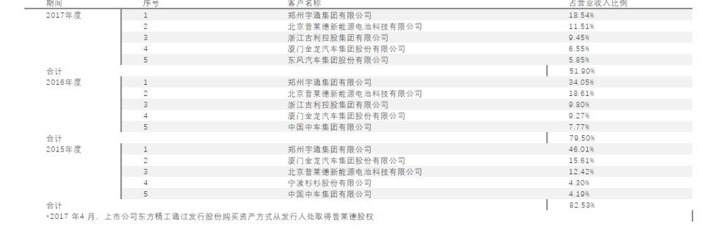 2015年~2017年的前五名顺序有一定的变化。但郑州宇通集团有限公司一直是宁德时代的第一大客户。同时可以看出宁德对前五大客户的依赖程度正在逐年降低。