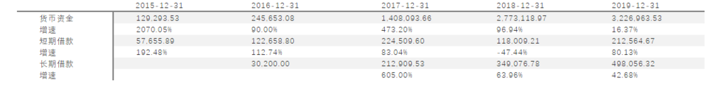货币资金体量增速巨大,足以覆盖短期借款。且运营资金有所富余。2016年之后才开始有长期借款,且体量并不大。偿债风险较小。