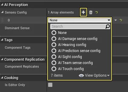 用户可以 AI 感知组件中配置感官类型,如「AI 伤害」、「AI 听觉」、「AI 视觉」、「AI 触觉」等等。